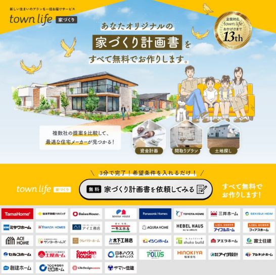 なお、家づくりの間取りプランをどうするかお悩み中ならコチラがとても便利です。入力は3分で完了。希望の条件を入れるだけで、選択したハウスメーカーから無料であなたオリジナルの家づくりの計画書が貰えますよ。