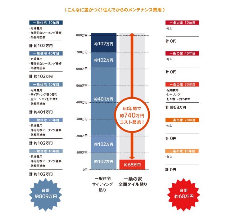 一条工務店アイスマートの30年間のメンテナンス費用は、およそ400万円弱といわれていますが、これは一般的な住宅のメンテナンス費用より大幅に安く、60年で計算すると約740万円もコスト節約になります。